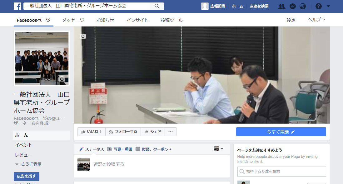 山口県GH協のFacebookページを開設しました。日頃の活動の情報など、活動の見える化や情報共有に活用して参りたいと思っています。ぜひ、御活用ください。当ホームページのリンクのページで「一般社団法人 山口県宅老所・グループホーム協会Facebookページ」をクリックして頂くか、Facebook上にて「一般社団法人 山口県宅老所・グループホーム協会」と検索してください。