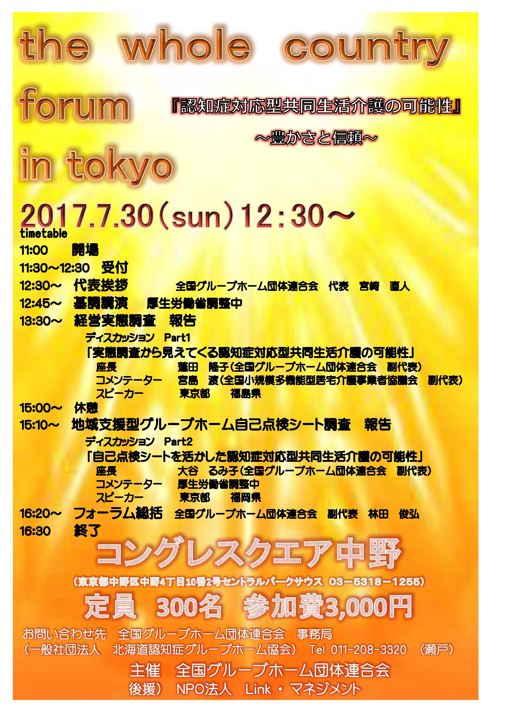 開催まで1週間を切りましたが、7月30日、東京都中野で開催される全国グループホーム団体連合会主催の全国フォーラムの参加者を追加募集しています!是非、御参加ください!