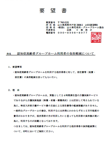 昨日12月11日、山口県宅老所・グループホーム協会として、認知症高齢者グループホーム利用者の負担軽減に関する要望書を村山監事と私で山口市長宛に提出しました。