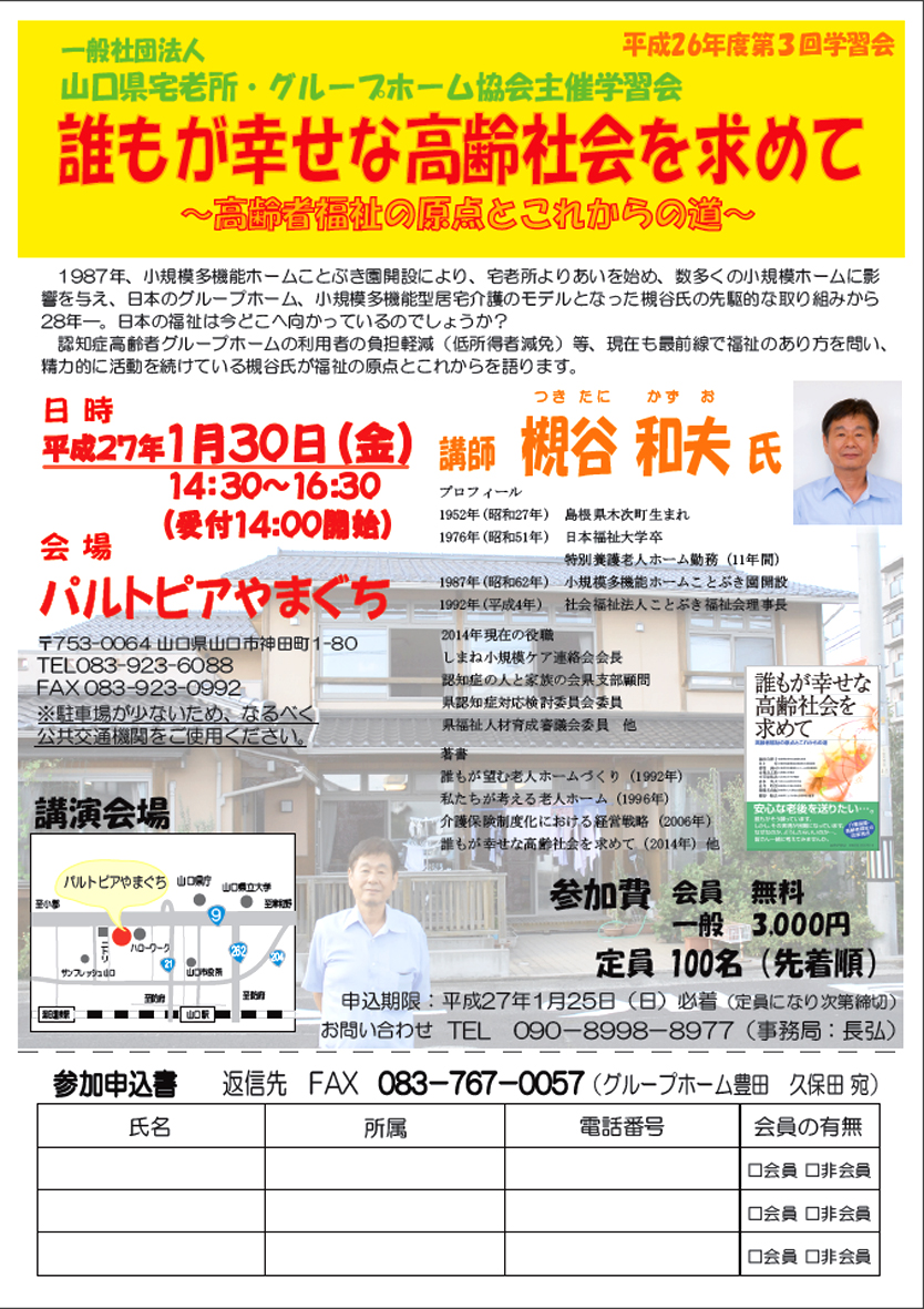 来月1月30日(金)に開催の学習部による学習会のご案内です。講師に島根県は出雲市より、社会福祉法人ことぶき福祉会の理事長であり、しまね小規模ケア連絡会会長の槻谷和夫氏をお招きします。社会福祉の原点とこれからについて、日本の小規模ケアの源流である槻谷氏の取り組みは必聴です。ぜひ、ご参加ください。