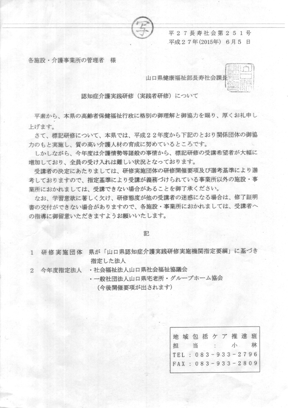 山口県健康福祉部長寿社会課より、認知症介護実践者研修に関するお知らせを頂きましたので、ご紹介します。